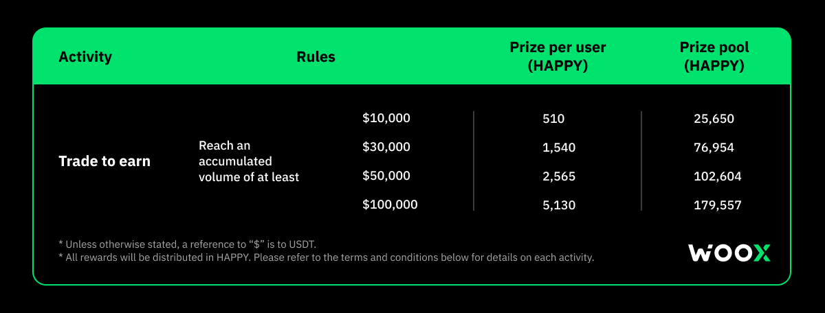 - All users who complete HAPPY trades, and meet the specific trading volume requirements indicated in the table above on WOO X during the activity period are eligible to share the stated prize pools.