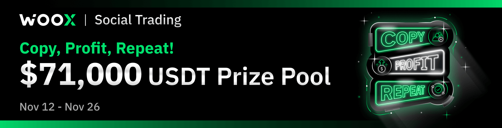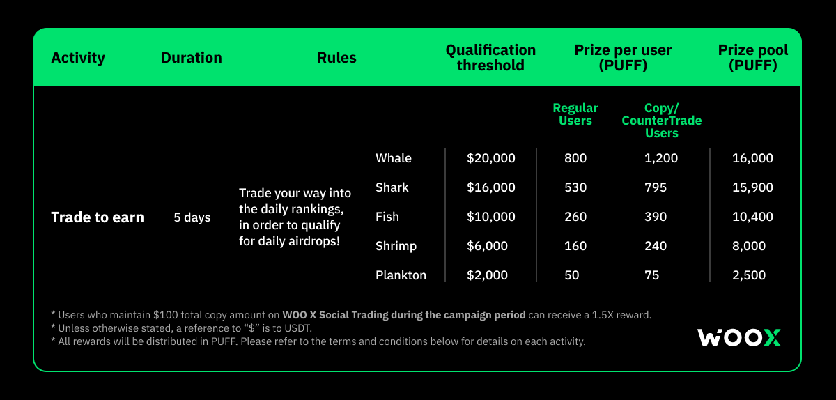 - Users with positions of at least 100 USDT in total copy amount on WOO X Social Trading, during the campaign period, will be eligible for 1.5X reward boosters!