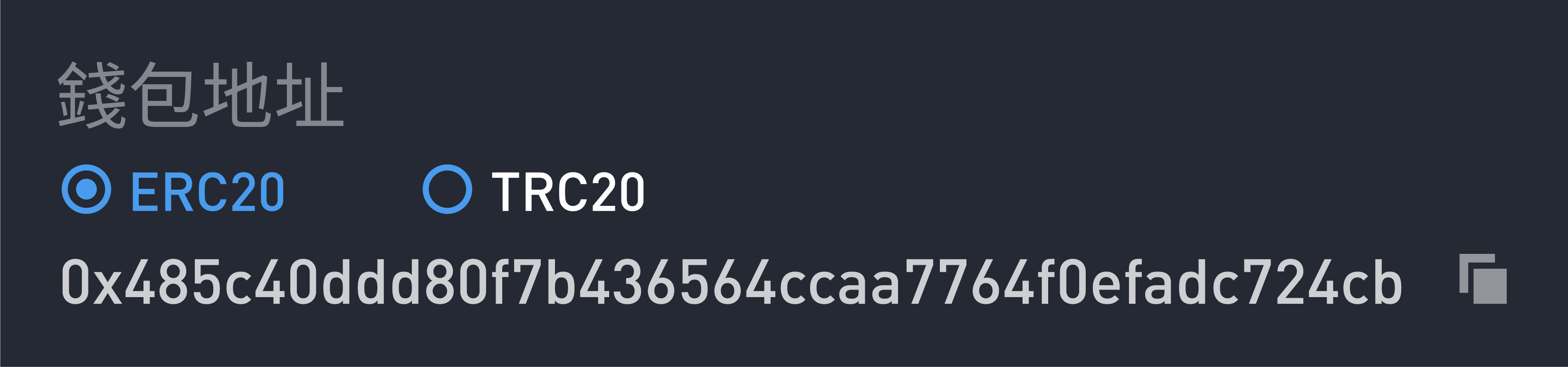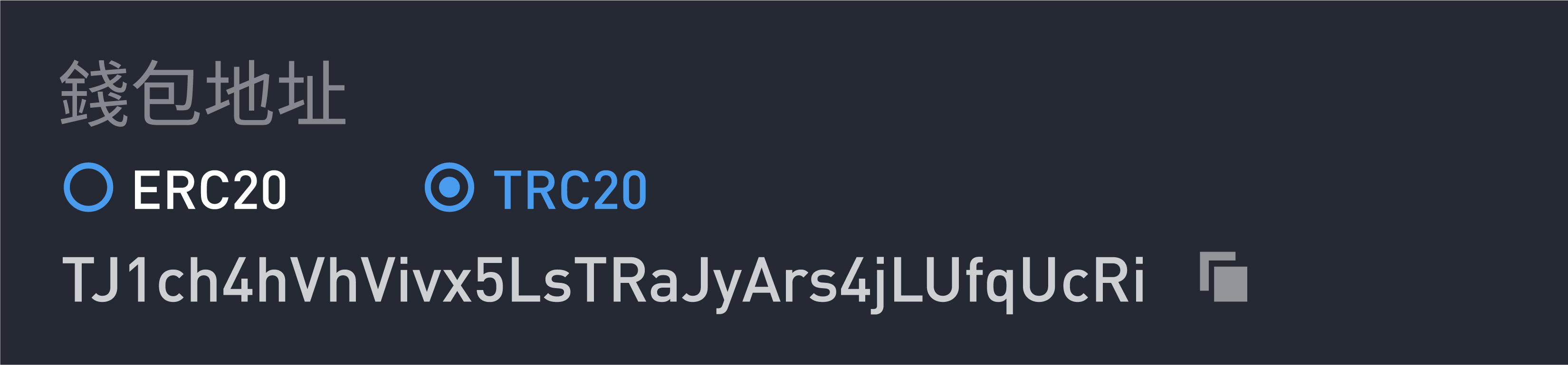 - 地址:一串由英文字母和數字所組成的代碼,可以公開並用來接收他人的轉帳。不同區塊鏈的地址格式會固定,舉例來說:Tron 的地址長度為 34 碼,開頭為 T;而 Ethereum 的地址長度為 42 碼,開頭為 0x。
