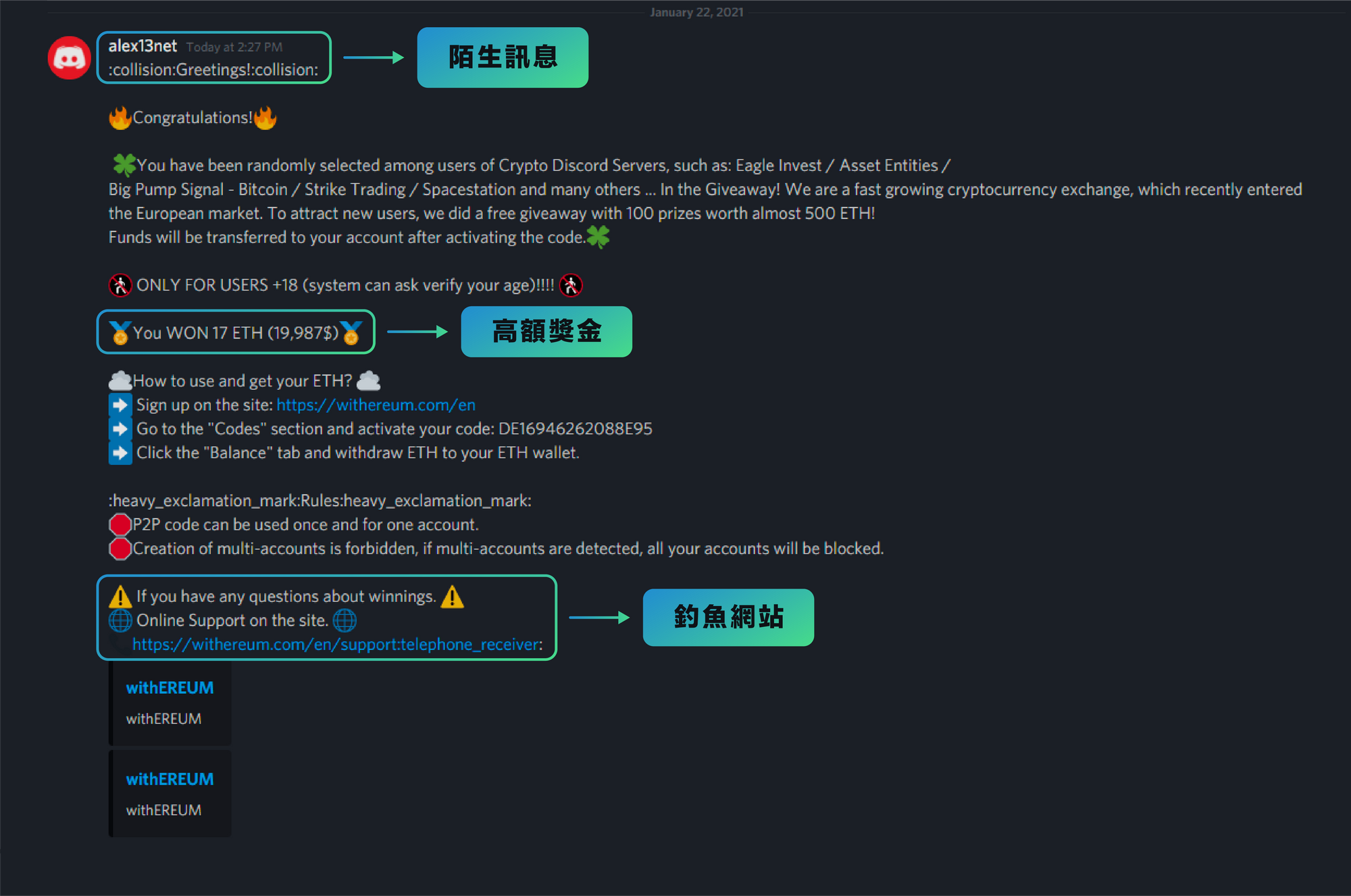 各個交易所的社群中,總有些冒名者試圖提供或推廣服務等詐騙訊息。請記住,交易所的員工以及客服永遠不會直接向你發送訊息並提供任何類型的服務,大多時候都只會在社群中回覆基本的問題,或是請你至官方網站提交需求,並由負責人員為你服務。
