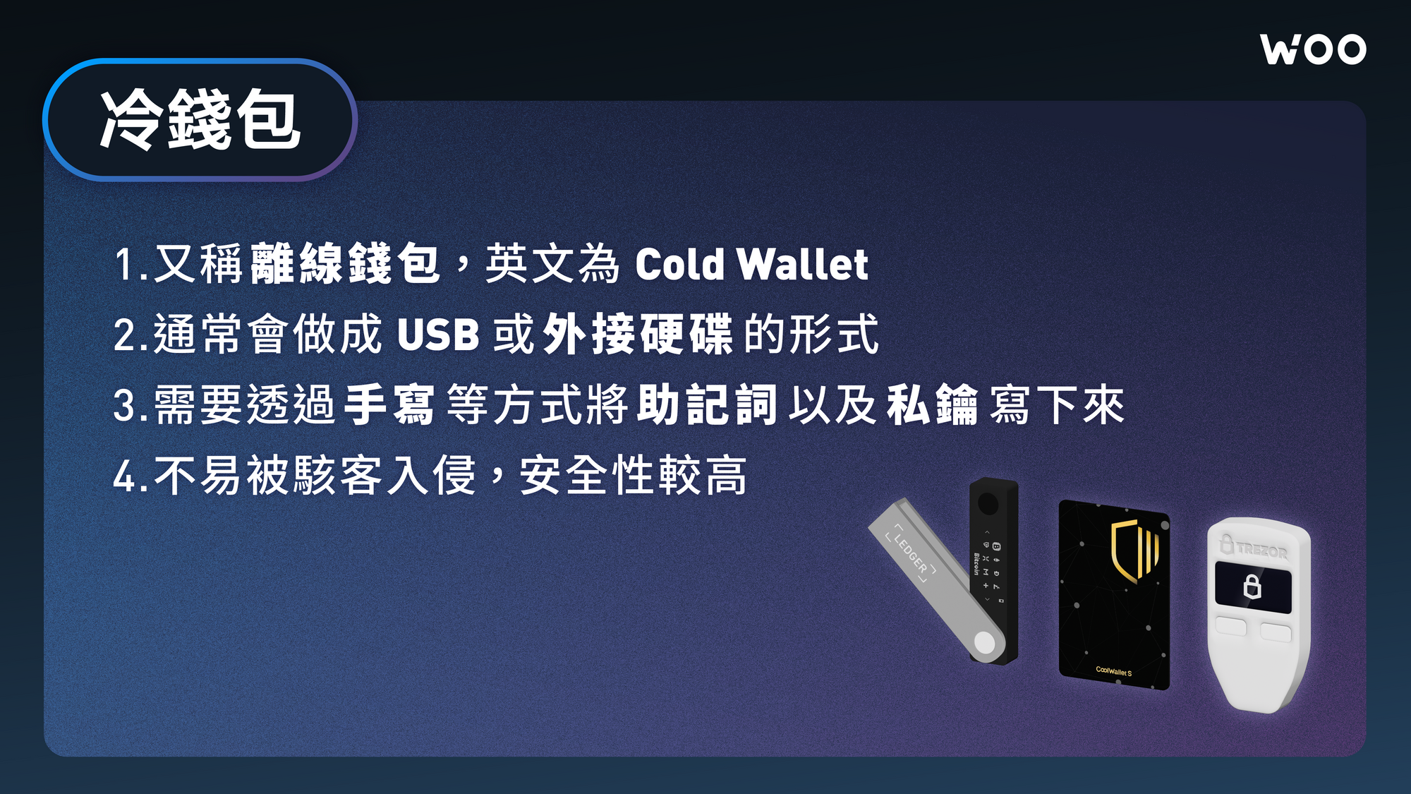 冷錢包又稱離線錢包,英文為 Cold Wallet,顧名思義就是透過「冷」裝置(不連網)的方式去確保私鑰的安全。冷錢包通常會做成 USB 或外接硬碟的形式,其私鑰不會存於網路上,且冷錢包的發行商也同樣不會知道。