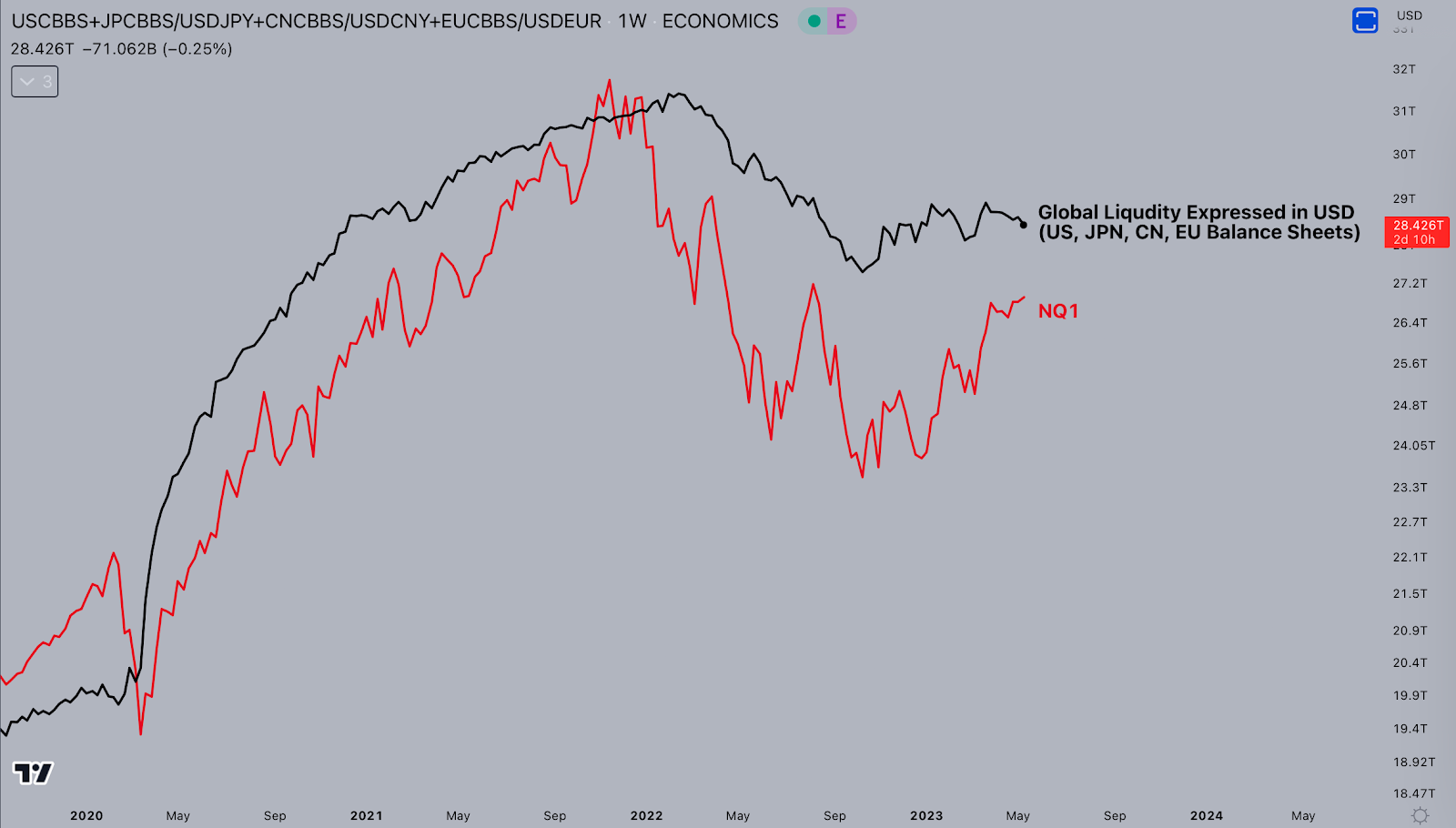 下圖顯示了全球的流動性狀況(美國、日本、中國和歐盟的資產負債表),以及納斯達克 100 指數(NASDAQ 100)的表現。可以觀察到,資產負債表擴張時市場如何反彈,以及當資產負債表衰退時,市場是如何迅速下跌的。